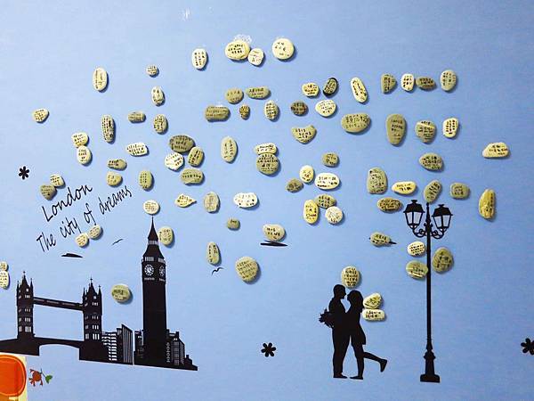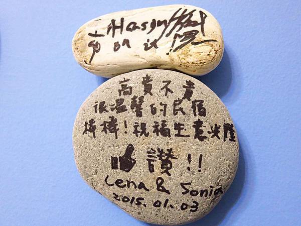牆壁上則是貼滿了石頭,這可是來這住過的旅客留下來的評價