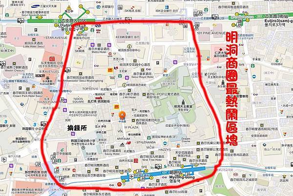 整個明洞商圈的範圍就在我用紅色框起來的地方